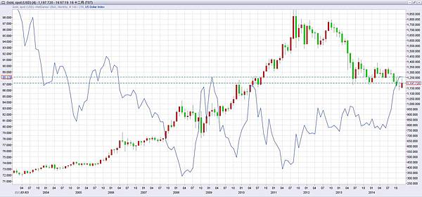 藍線為美元指數,價位是左軸;K線是黃金價格,價位在右軸